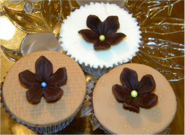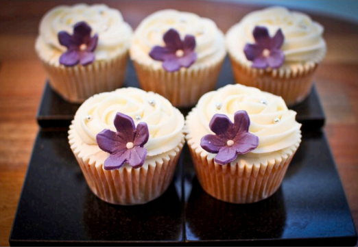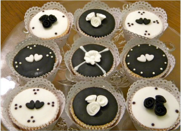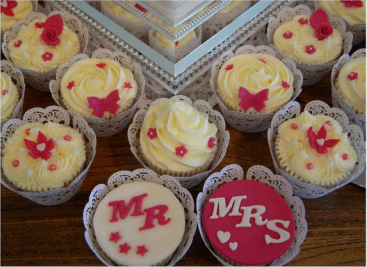 A cupcake tower gives you plenty of flexibility in terms of numbers, flavours and designs. The cupcake tower can be complemented with a 6" or 8" cutting cake. Cupcakes can be served at the wedding or presented to your guests as favours. Cupcake decorations: All cupcakes can be colour coordinated to match your wedding colours and theme.
