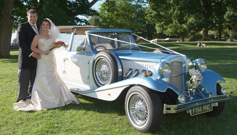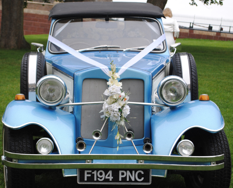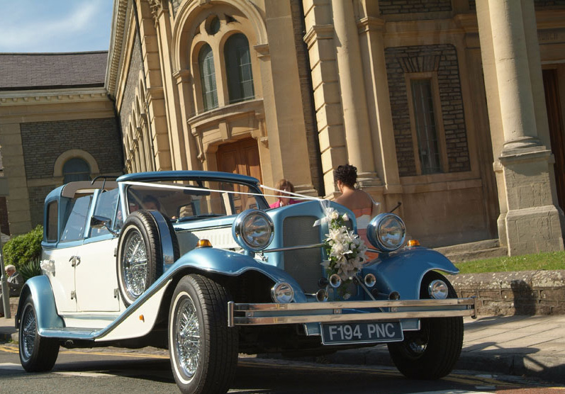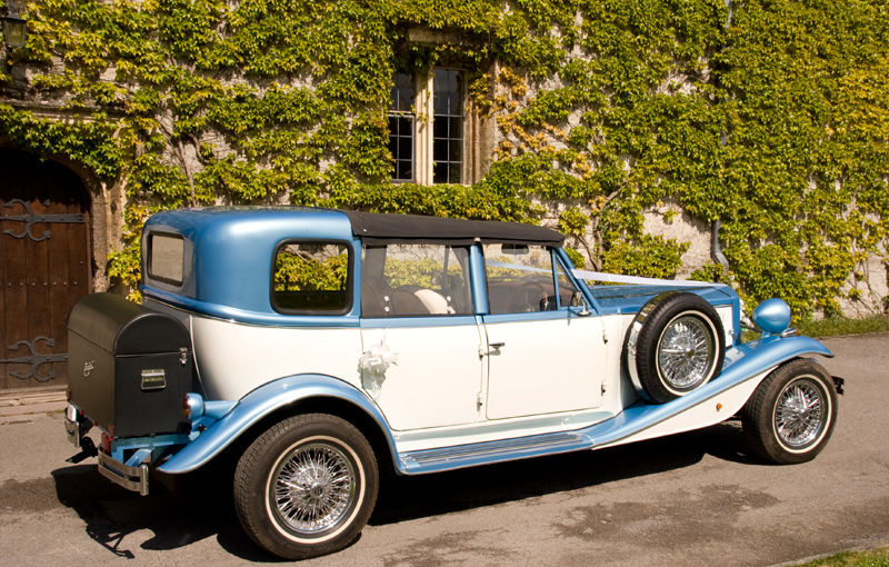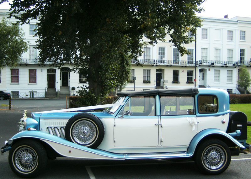 Wedding Cars Bristol includes a stunning Sky Blue 4 door Beauford Open Top Tourer. These vintage cars come with Cream Umbrella, cream leather interior, white sheepskin rugs and tasteful floral decorations in the rear window.