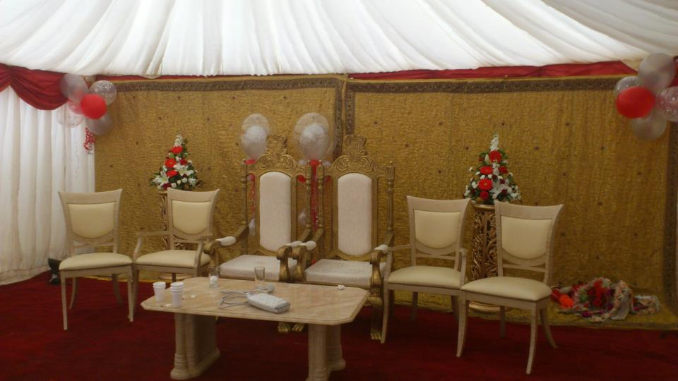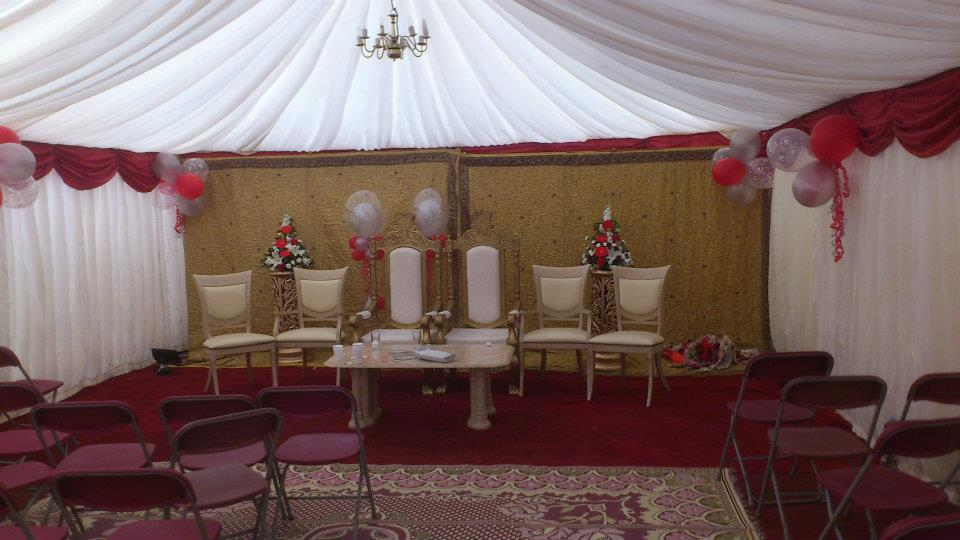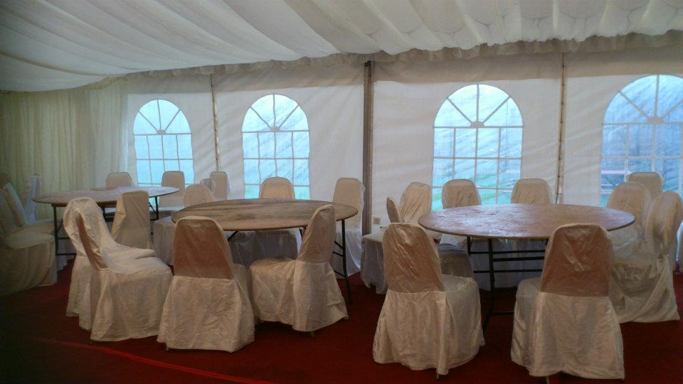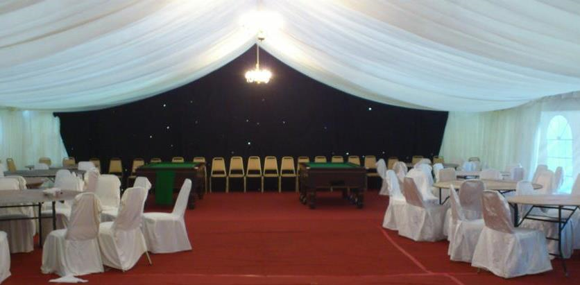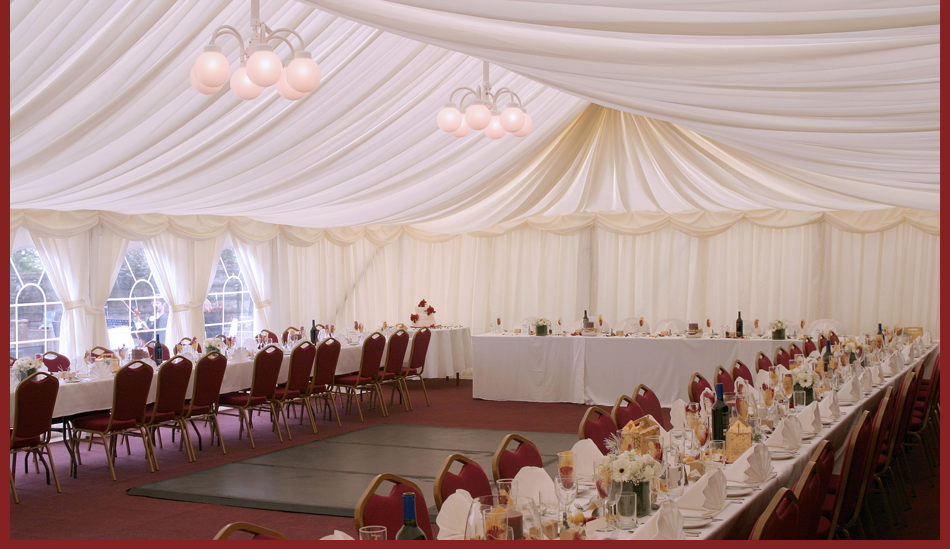 We are able to provide pleated ivory linings and colour co-ordinate the valance and wall covers so that it matches or complements the bridal colours or the colour scheme of your wedding. We can customise the marquee as much as you'd like.