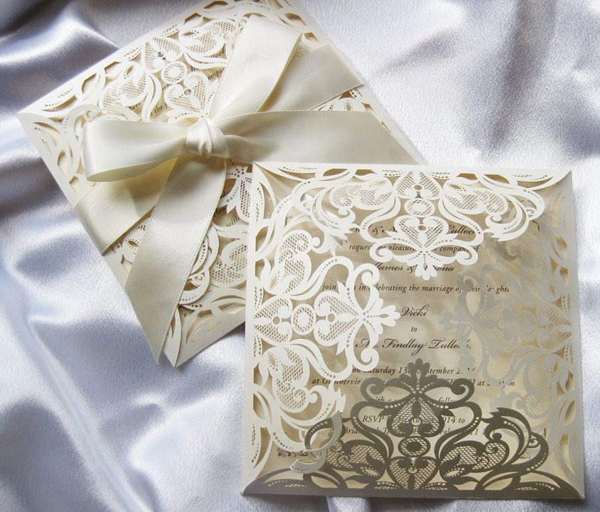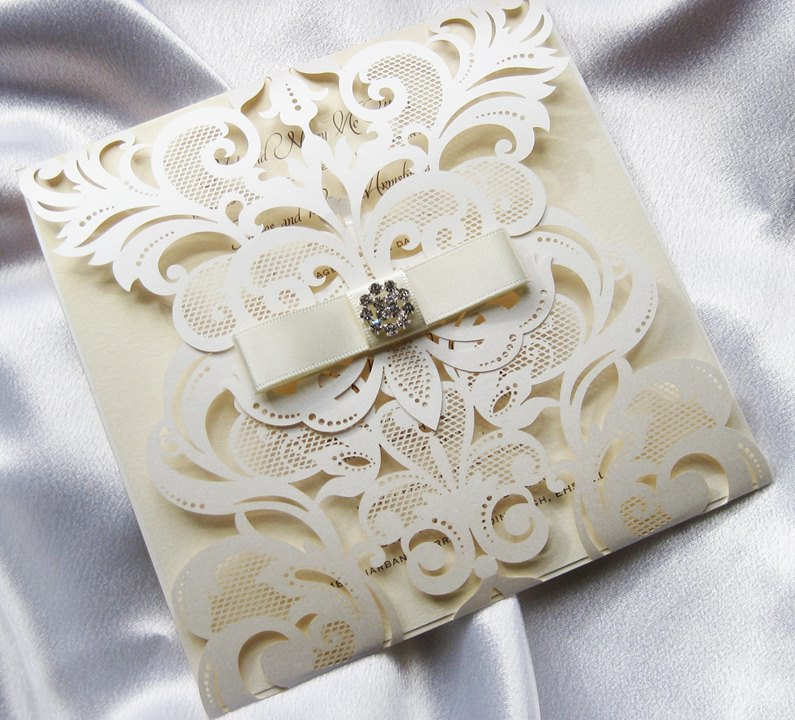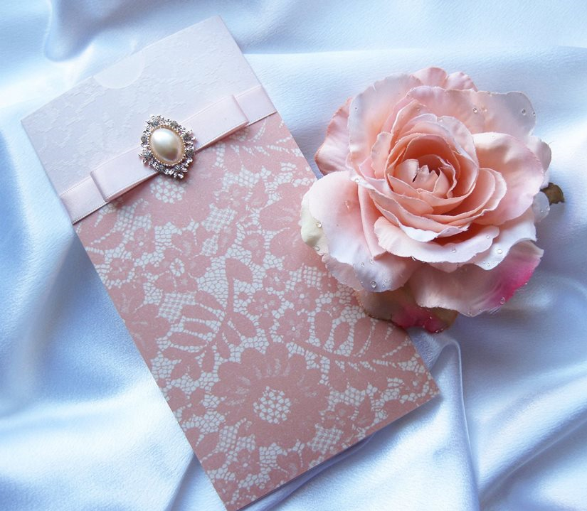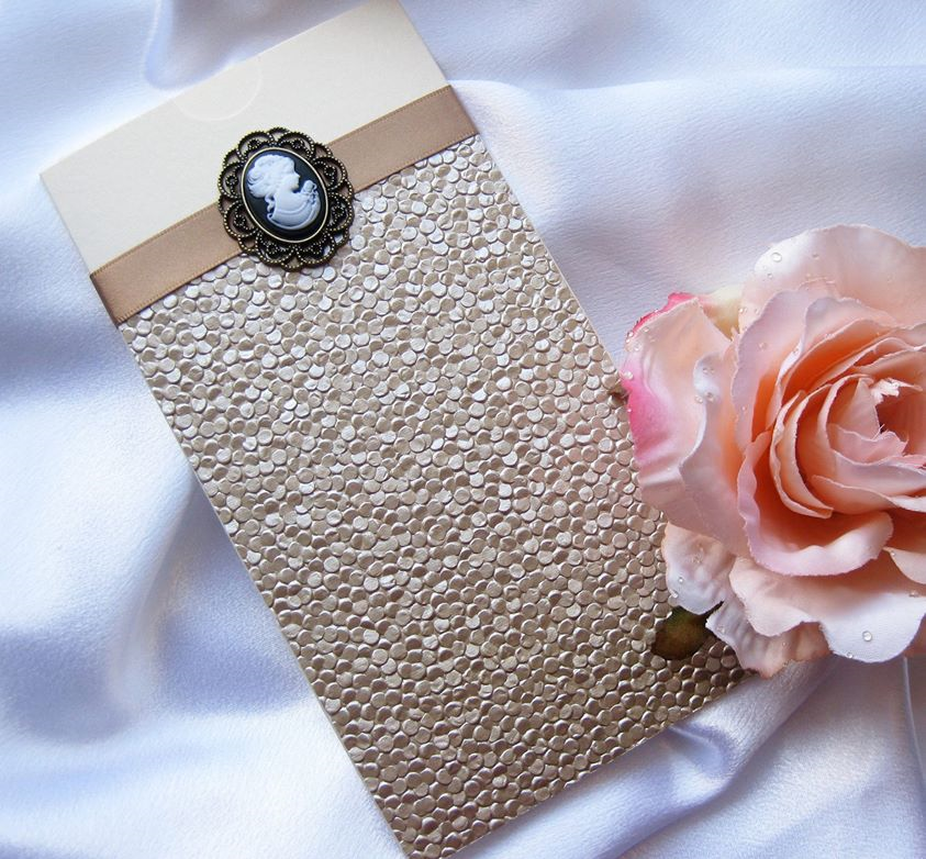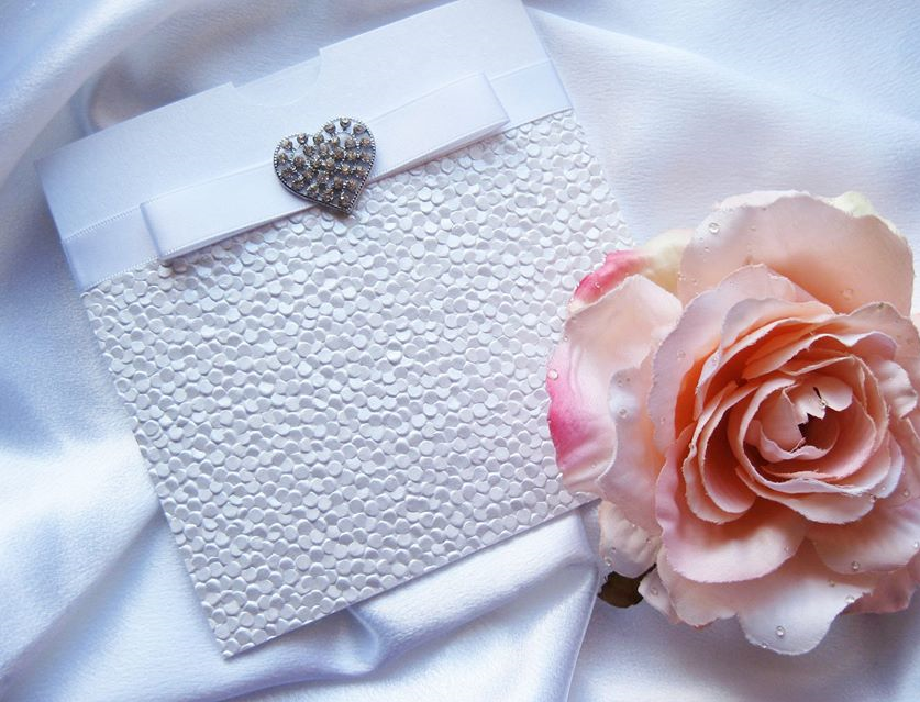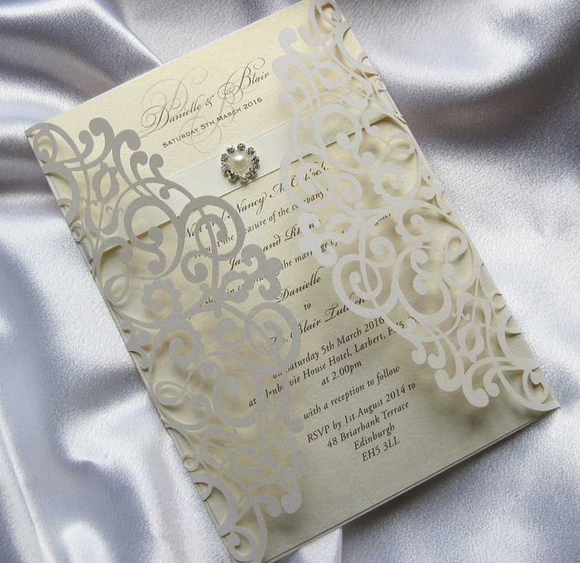 We have been producing hand-made wedding stationery for almost 10 years and our designs are extremely flexible. The great majority of our cards are cut and scored in-house, meaning that the size and shape of very many of our designs can be changed. And of course, the colours of ribbons and crystals can be selected to match your theme. If you do not see exactly what you would like please ask about this flexibility and of course a bespoke option.