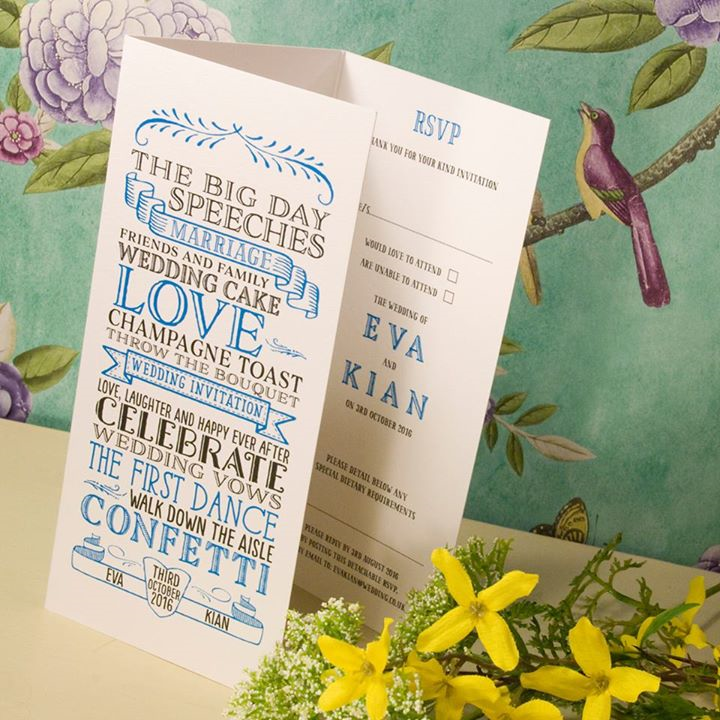 Customisable Our creative wedding invitations can be fully customised to suit your wedding theme / colour. The unique 3-fold, Wallet and Swatch shapes have been created to provide space to show your wedding information, this could include directions to your venue, map, gift list, accommodation, etc.