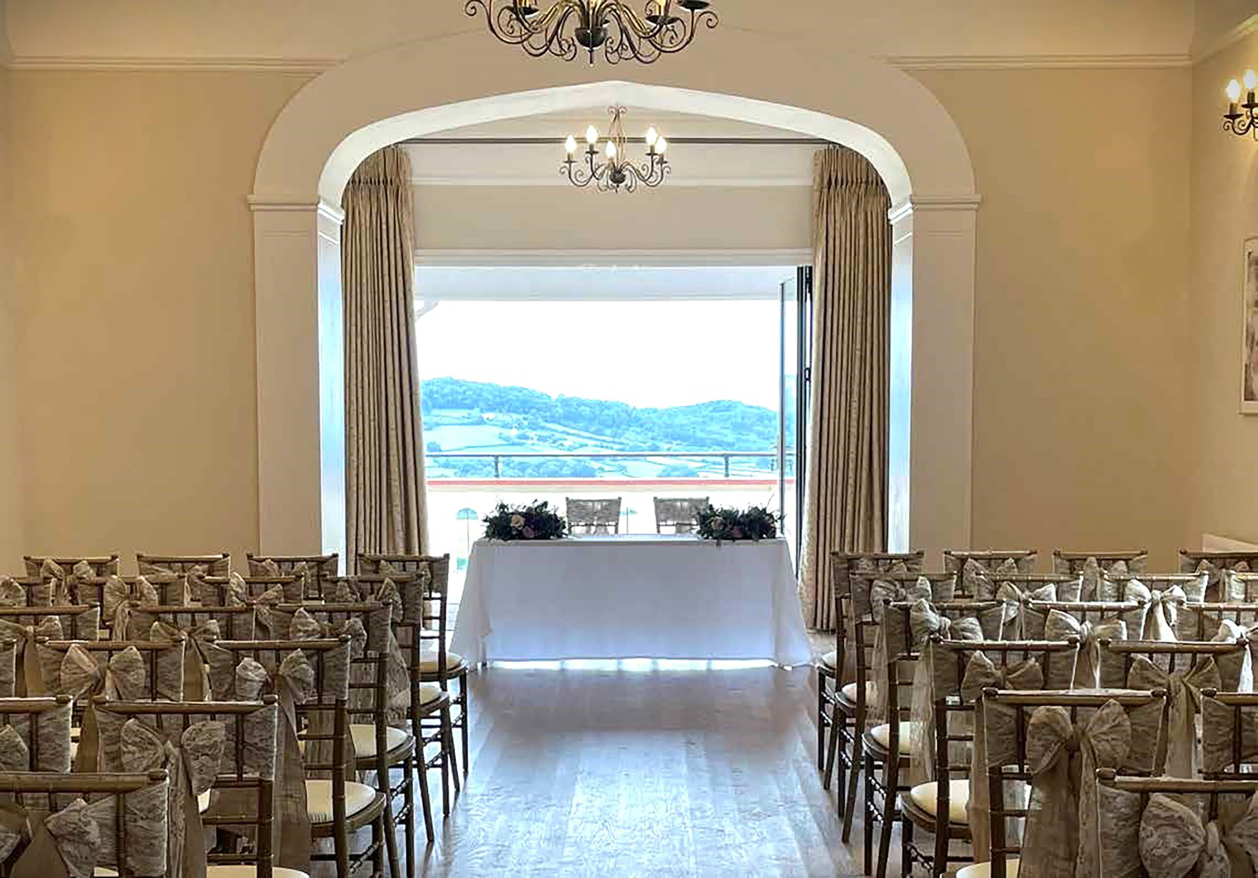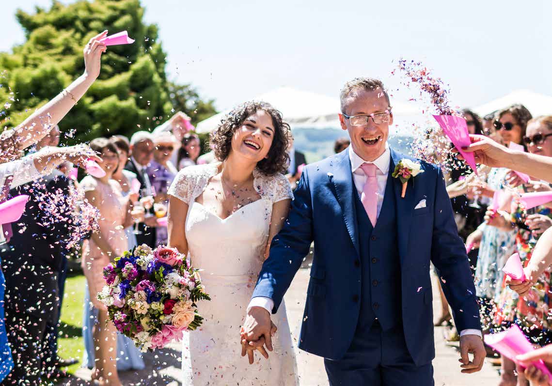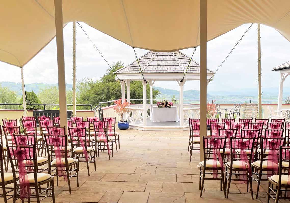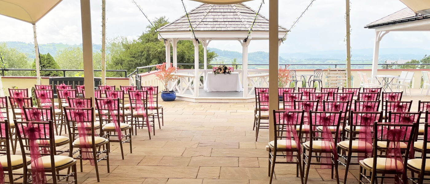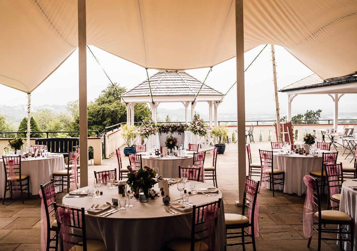 You can choose from a variety of indoor or outdoor settings in which to host your ceremony and reception. The gazebo makes for a perfectly romantic space for you to exchange vows. With views of the countryside in the backdrop, this area provides great photo opportunities as you commit yourselves to a life together. There are beautiful verandas to accommodate your drinks receptions with a spectacular view and plenty of shade for those sunny days. Here, you can sip on your favourite tippple and watch as the sun sets over the Welsh countryside. You can wander around the stunning grounds and garden, a beautifully natural setting for your photographer to capture those first moments as a married couple.Ceremonies and receptions can be hosted for up to 80 people with up to 120 in the evening.