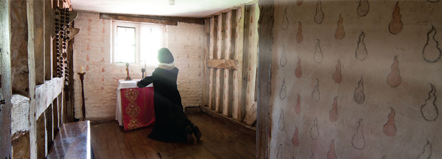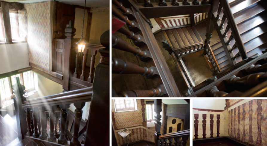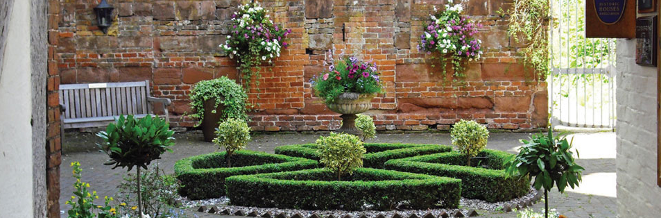 The approach to some historic mansions is dignified, even imposing, with lodges and gravel drives or avenues of oaks and limes. Harvington is more casual. You reach it up a narrow lane from the village pub, twisting past cottages and houses, a field full of sheep and an ancient quarry, now used for parking tractors. There is a laurel hedge and glimpses of a sheet of water. Then suddenly you emerge into an open space with a church and stables at the far side. Before you, across a lawn, is a great pile of red-brick chimneys and gables, rising from a moat overhung by trees.