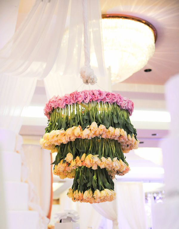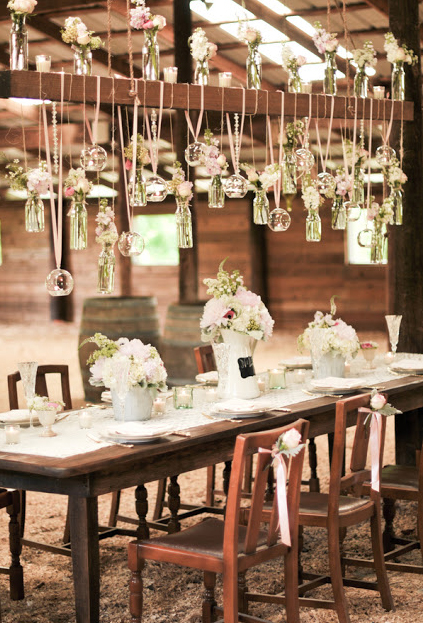 It’s a chandelier, but not as you know one. Glass vases and globes filled with flowers and candles hang from pale pink ribbon and twine looped over a wooden beam to create the ceiling for a gorgeous rustic setting.