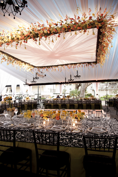 Citrus accents look great on a table, such as when you fill vases with a bounty of oranges, limes or lemons. But the magical colour combination looks just as great in floral form, especially when flowers on the table are echoed by a display of vibrant blooms, forming an unusual overhead square that helps to frame the guests.