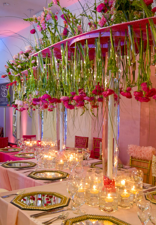 How does your garden grow? Upside down by the looks of it. You’ll be tempted to crane your head for a different perspective when you’re sitting down at this table, but that would spoil the painstakingly created effect of the tableau, which is a beautiful ceiling of lush pink blooms.