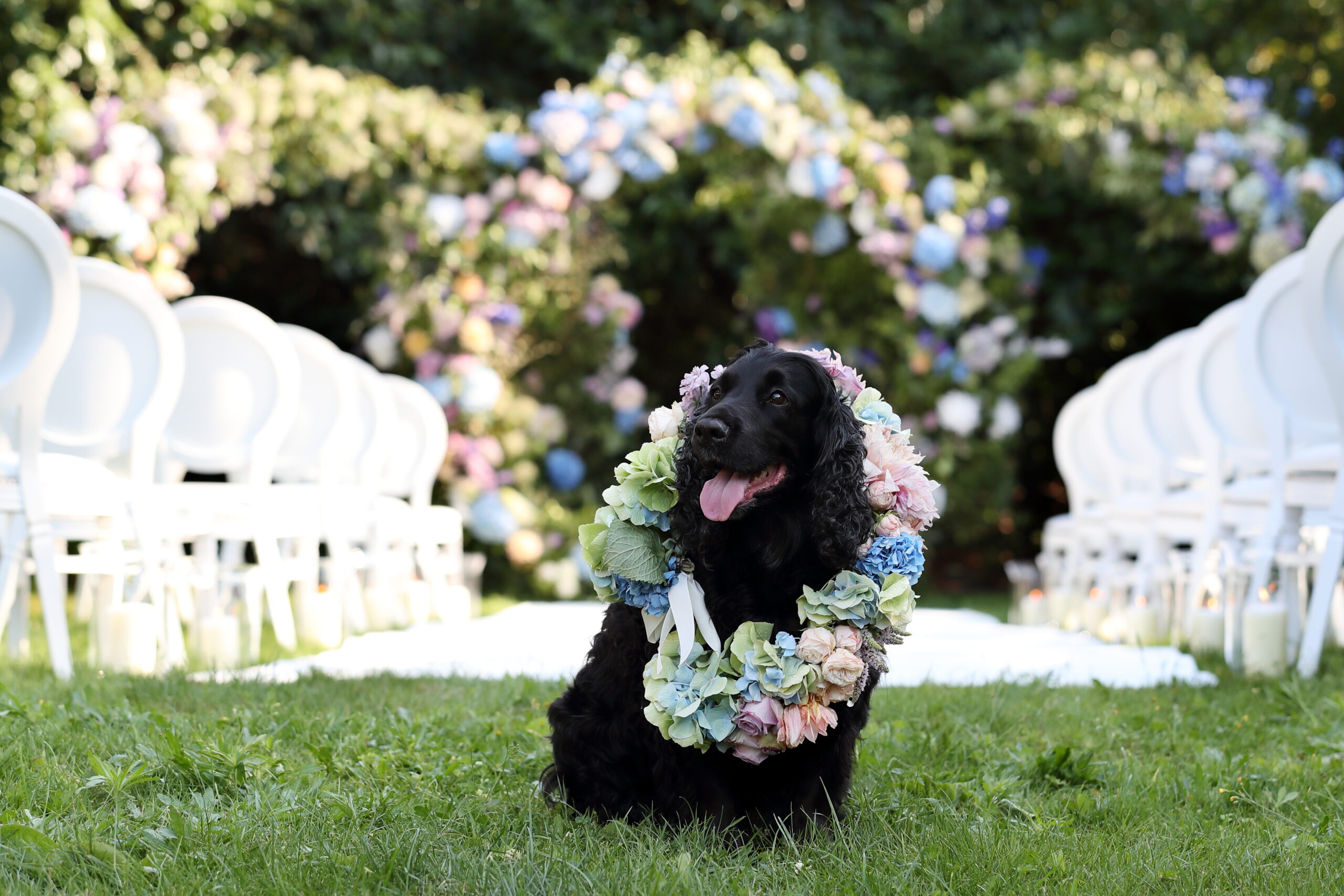 Walking down the snow-white aisle is many a bride’s dream, with flickering storm lanterns to guide you towards the floral bower where your ceremony will take place. Our faithful pup, Maisy, also proudly carried the ring, adorned with a pretty floral garland by The Floral Editor.