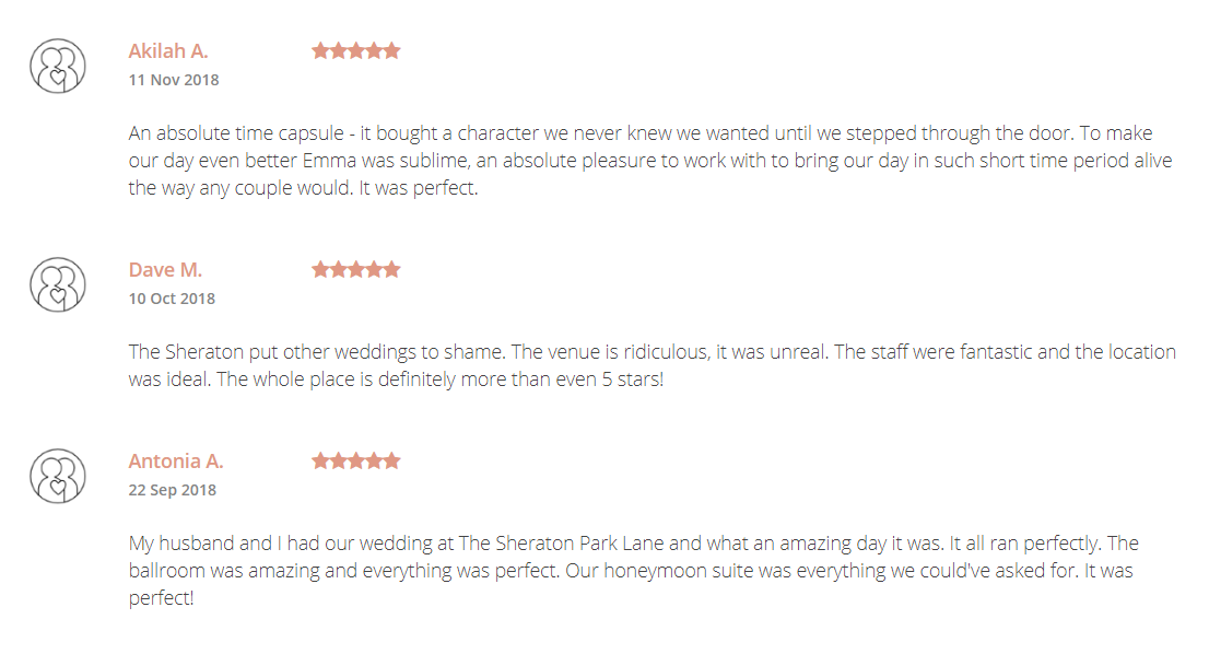 As well as a complimentary suite for the bride and groom, the Sheraton Grand London Park Lane are happy to offer you a heavily reduced rate for more than ten guest room bookings. They can provide a hassle-free link to share with your guests so they can book direct. But if you’d rather not be tied into the minimum of ten rooms, the Sheraton Grand London Park Lane can offer a 15% discount off the best available rate with flexible cancellation. They recommend to book any accommodation for guests as soon as possible.