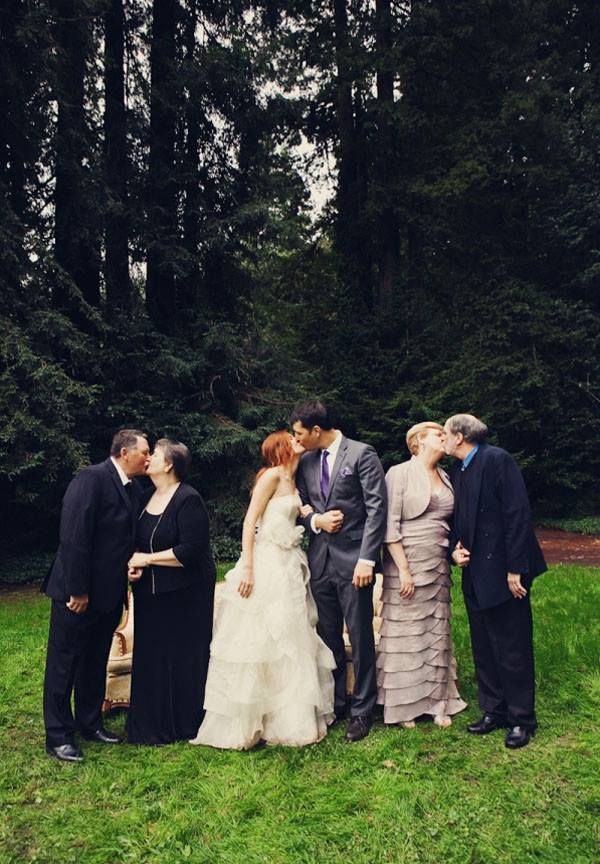 If you’re lucky enough to have two sets of parents (or even your grandparents) at your wedding day, try to capture this absolutely lovely shot, of each spouse giving the other a peck on the lips!