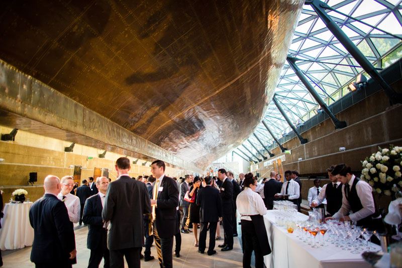 Across the floors that surround this triumph of maritime engineering, there are four event spaces of various sizes overlooking the shores of the River Thames. The most celebrated venue is the lower floor beneath the hull. It is an awe-inspiring space for up to 450 for drinks or 240 for a banquet. With added uplighters, colour beams will reflect on the shimmering copper hull and rise up passed the towering masts to the geometric glass ceiling. Dine, drink and dance in nautical glamour beneath the hull or on top deck, the choice is yours.