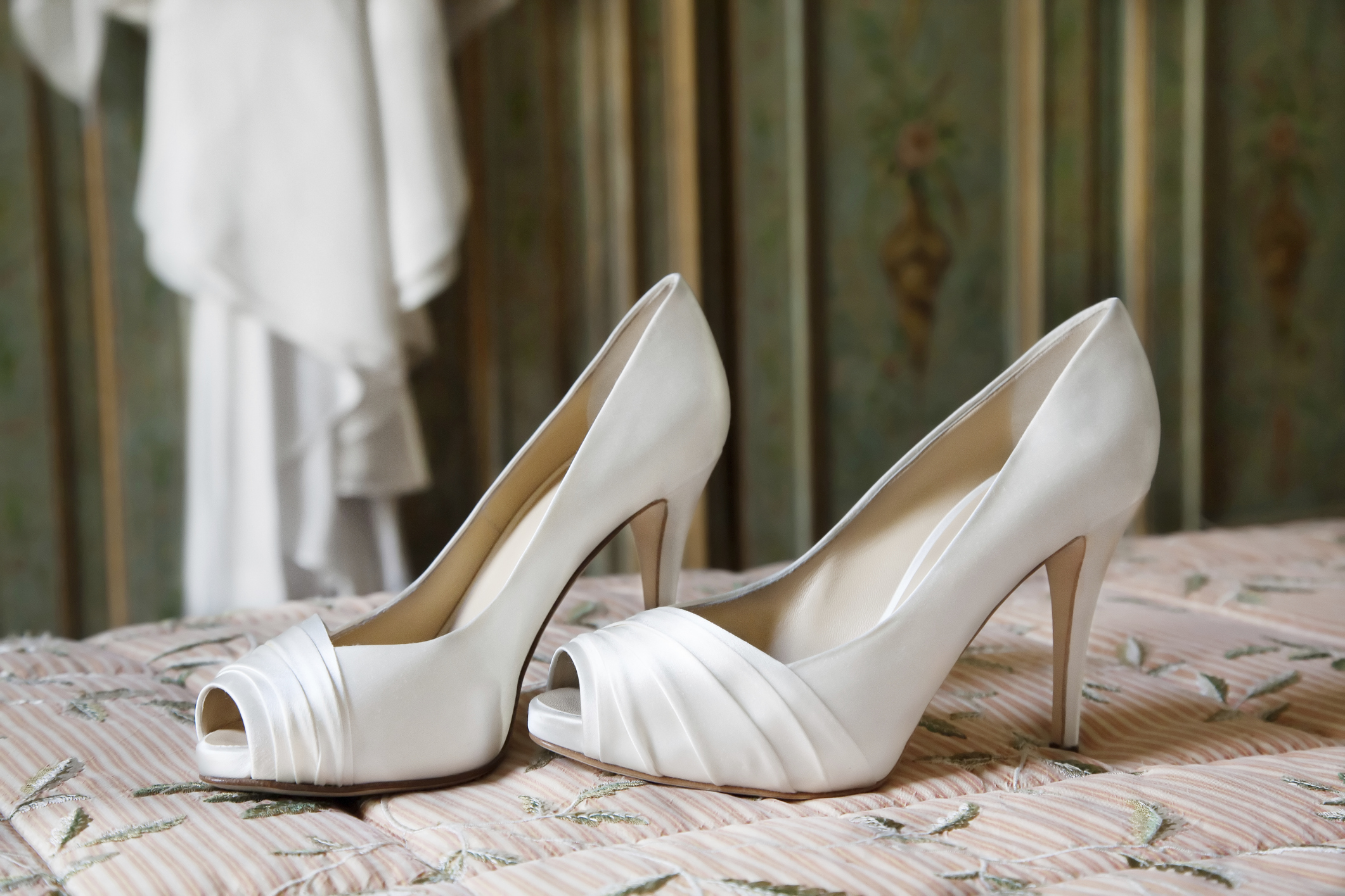 If you’ve chosen a traditional white wedding gown, you will probably have an easier time finding shoes that match than if you had decided to wear an ivory dress. However, it still worth taking a swatch of wedding dress material shopping with you as there can be quite significant differences between whites, especially when the fabrics don’t match completely.