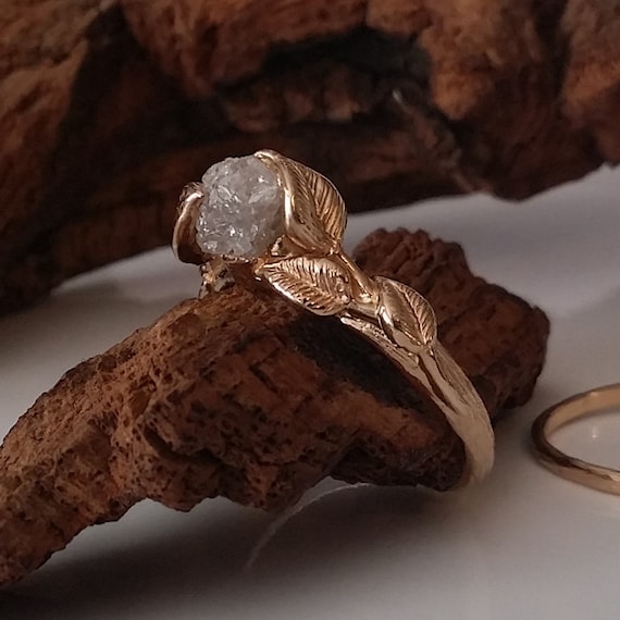 Who says that raw diamond engagement rings have to be on a plain or simple band? This gorgeous golden leaf design shows off the raw diamond perfectly. Each leaf is individually hand sculpted!