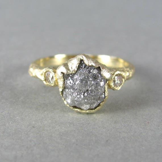 This elegant gold and gray diamond trilogy ring is another gorgeous example of a raw diamond engagement ring. It features two champagne diamonds on either side of the huge 2.5ct gray uncut diamond.