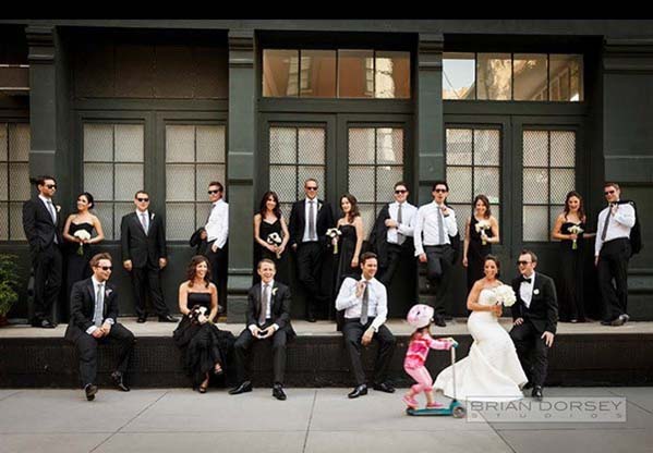 A little girl in pink zips past this formal bridal party and adds a little impromptu fun. photo. Image: Brian Dorsey Studios.