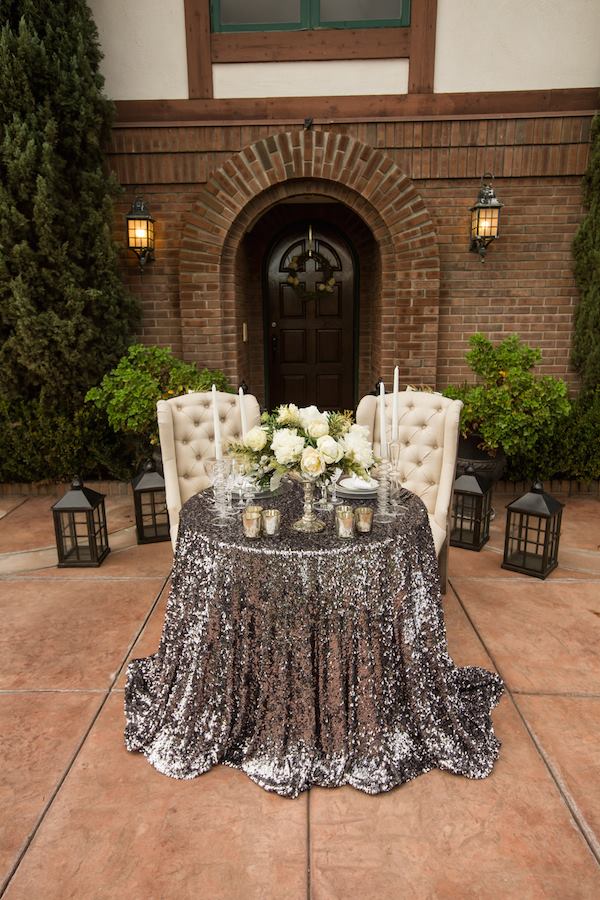 Well, this is a divine and tres modern idea for a no-fuss yet utterly glamorous head table! It’s a simple table covered in an eye-catching and seriously blingalicious cloth that is only set for the bride and groom. They can sit there when they want a few minutes alone – and mingle with guests the rest of the time!