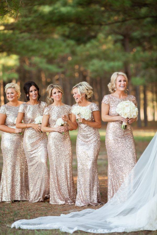 The bridesmaids, in their glittering Badgley Mischka gowns, are the stars of this wedding photo!