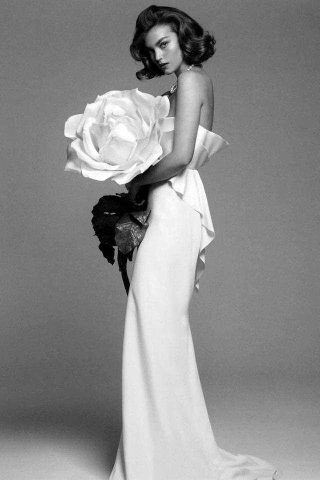 We love the styling of this shoot, featuring gorgeous American model Arizona Muse. Aside from the sleek, ruffled gown and Arizona’s hair, we can’t take our eyes off that single-bloom bouquet!