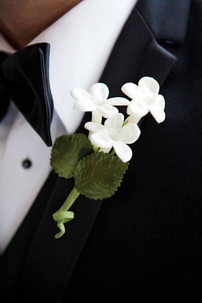 Classic black and white, with a little pop of green makes for a striking yet simple boutonniere.