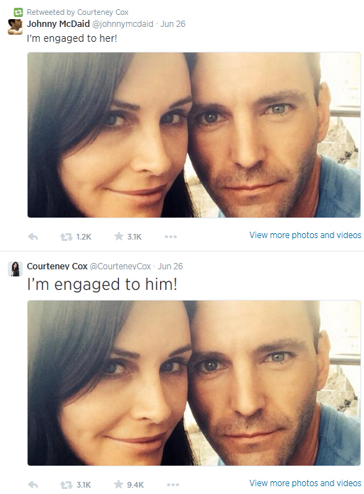 37-year-old Irish Snow Patrol band member McDaid proposed to the Friends star before they simultaneously announced the news on Twitter with a ringless engagement selfie. The pair have been dating since October 2013 and have the red-headed hunk Ed Sheeran to thank for their fateful romance after introducing the pair. This will be the second marriage for 50-year-old Courteney who divorced Scream series actor David Arquette in 2013.