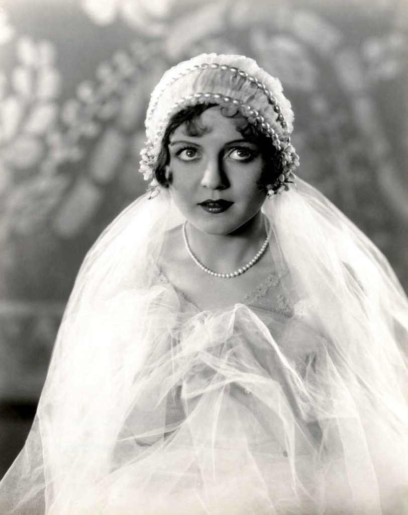 The juliet cap veil and headpiece is the central feature of this voluminous 1920’s gown, with period make-up and hair style complimenting the vintage streak in a wedding dress typical of the time.