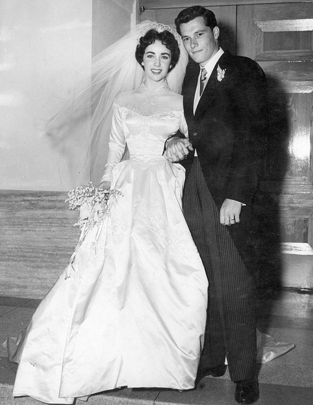 Nothing says Old Hollywood like Liz Taylor. In a lace and ivory gown with puffed skirt and tight bodice, she cuts a remarkable figure standing next to her first husband Conrad Hilton in 1950.