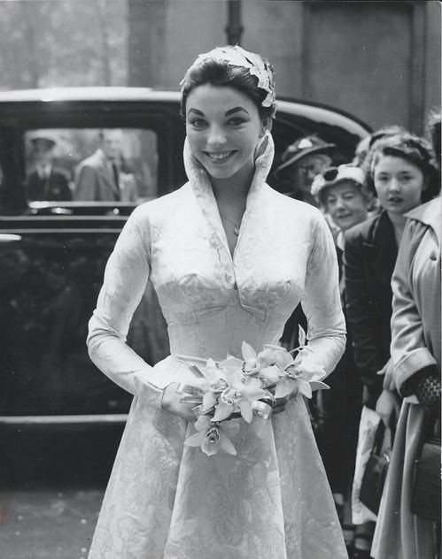 To round off our list we have a grinning photo of Joan Collins in the early 1950s. Her stylish up-do is held by a simple headpiece and works with the bolero jacket and simple gown to frame her face. The orchid bouquet works with the subtle pattern on the gown in a dress that wouldn’t look out of place at a wedding today.