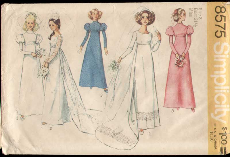 When we talk about vintage style we can’t help but include examples of the just-do-it attitude of the past. This Simplicity sewing pattern from 1972 outlines how to make three different styles of wedding gown and accompanying bridesmaid dresses. All feature sleek Empire bustlines that were as popular at the time as they are today.