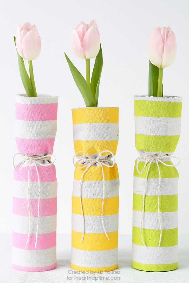Fabric is a fabulous way to turn an otherwise ordinary vase into a work of art that can tie into any wedding colour, pattern, theme or texture you desire. A brilliant idea.