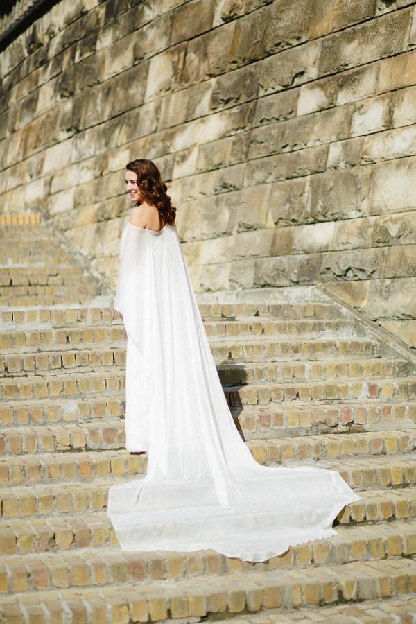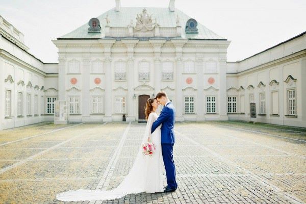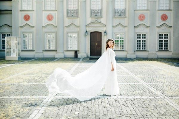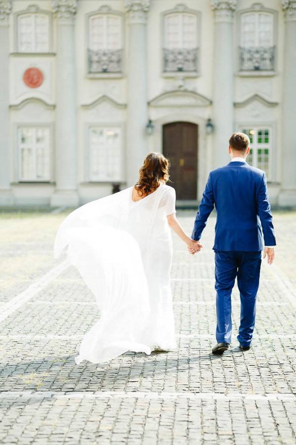 The word ‘cape’ conjures visions of superheroes rather than brides, but this beautiful Polish bride has pulled off a white wedding cape with aplomb. And how eye-catching is her groom’s exquisite blue suit? ♥