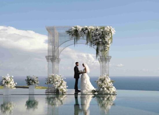 The Uluwatu offers a variety of ceremony and reception spaces, each with its unique features and settings. For your vow exchange, choose The Sky Water to walk down a glass runway over a clifftop pool, or the Ocean Chapel, featuring a set of elegant glass windows. After the ceremony, host a reception dinner with a majestic sunset backdrop at The Lawn, a tropical garden setting at the Garden Patio, or a warm, intimate atmosphere at The Gazebo. For an exquisite dining experience, The Uluwatu offers curated menu selections by the internationally acclaimed resident head chef.