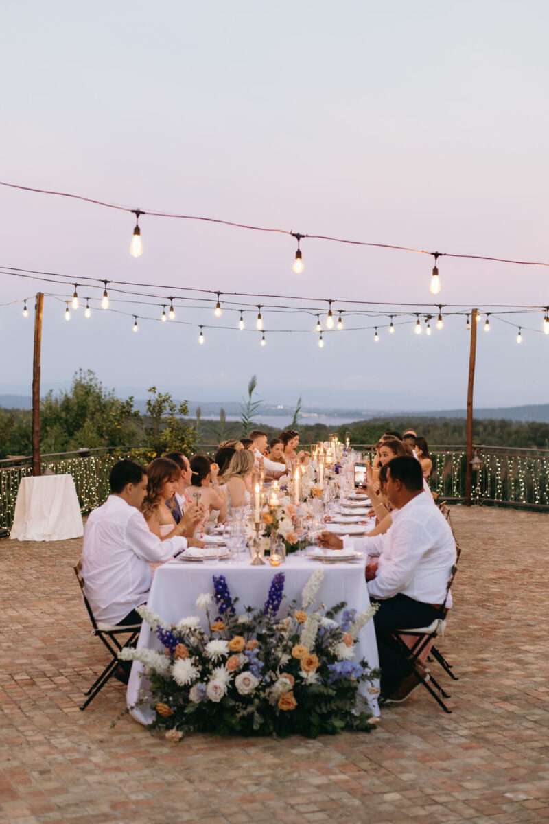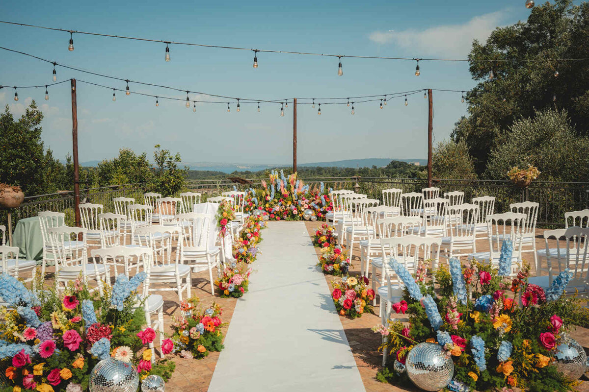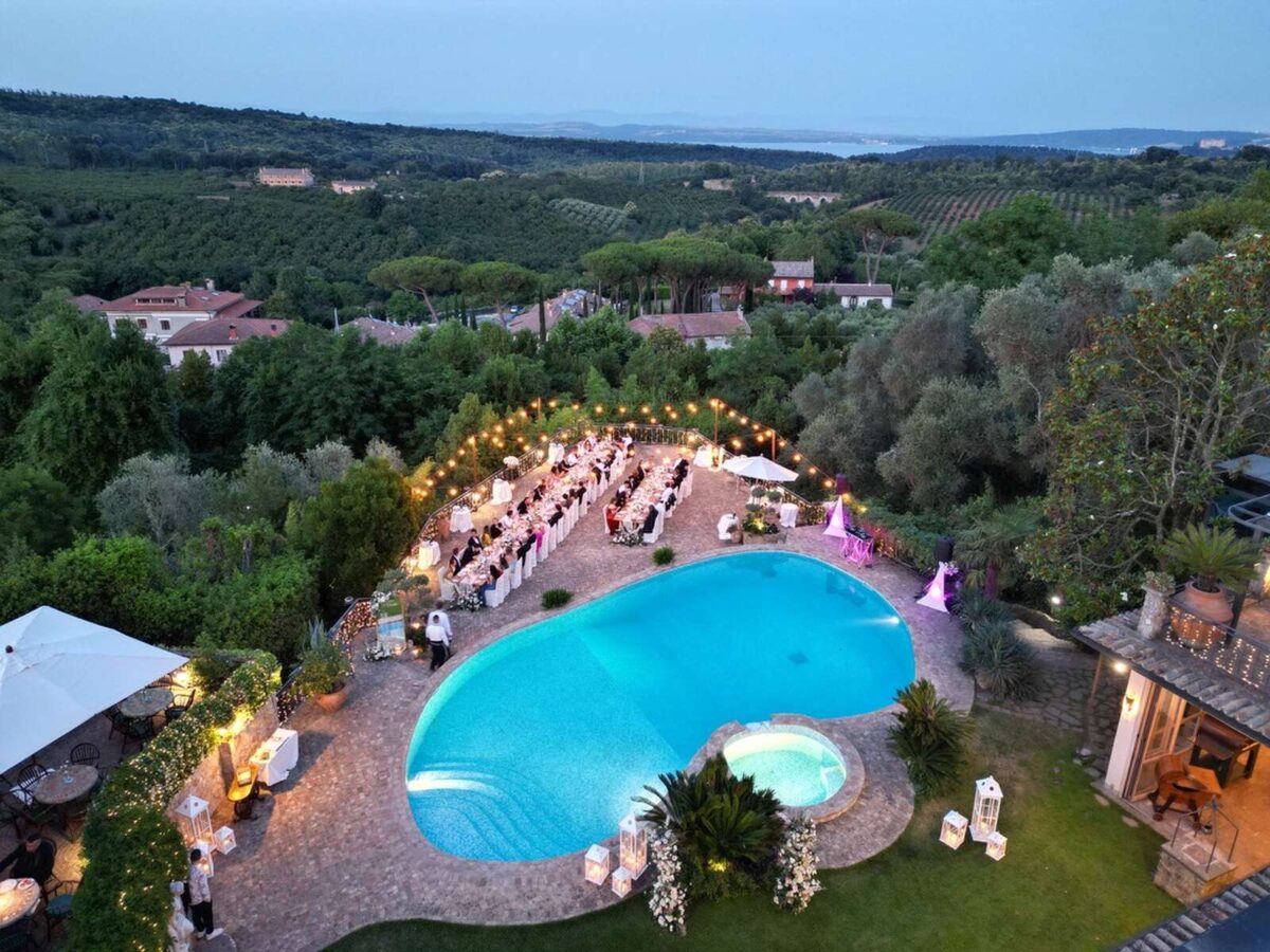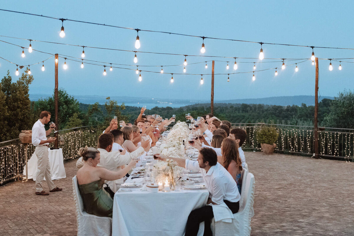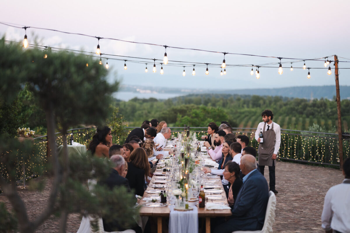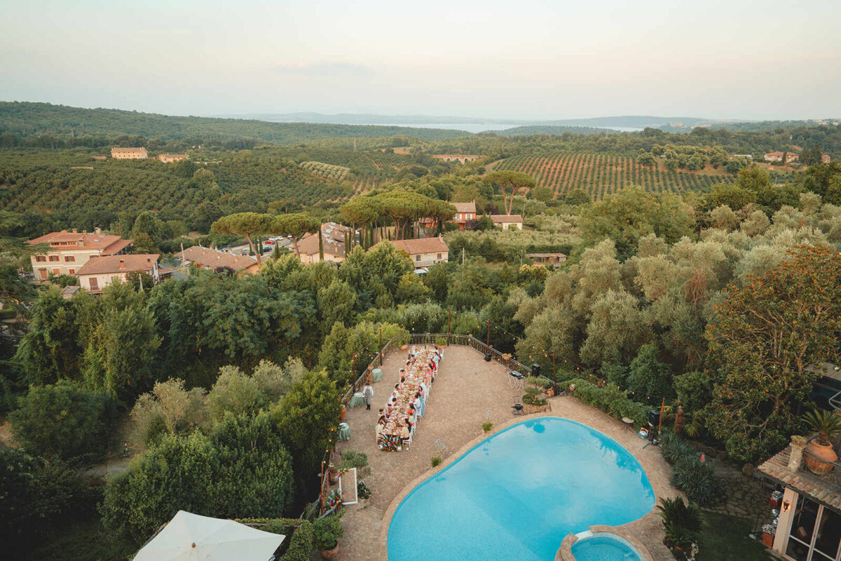 At Villa Clodia, the experience begins the moment guests arrive, stepping into the villa and taking in the quiet of the surrounding countryside. Time is given to settle in before gathering for a terrace ceremony, where the views stretch out towards Lake Bracciano. From there, the celebration shifts into an aperitif as the light softens, with conversations flowing across the gardens and open spaces. As evening draws in, everyone moves indoors or onto the terrace for dinner, where the atmosphere deepens and the celebration carries on in a way that feels effortless, guided by the setting rather than a fixed schedule.