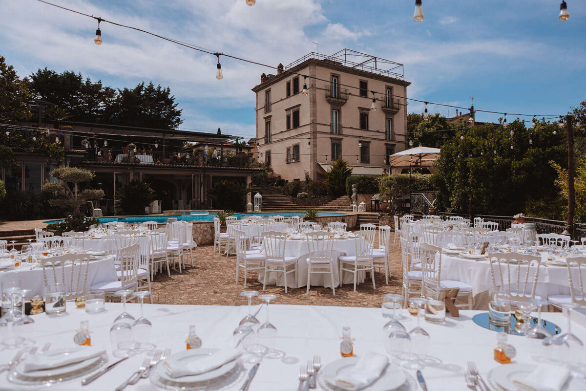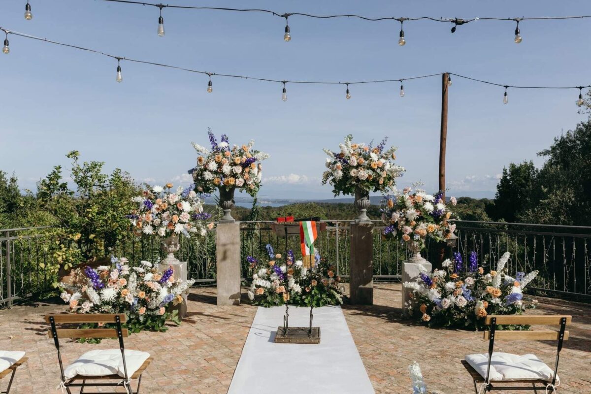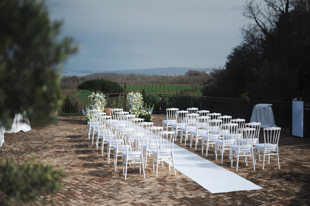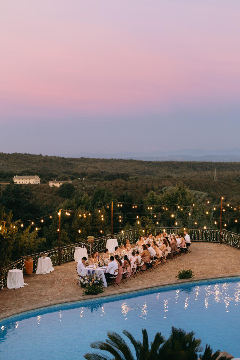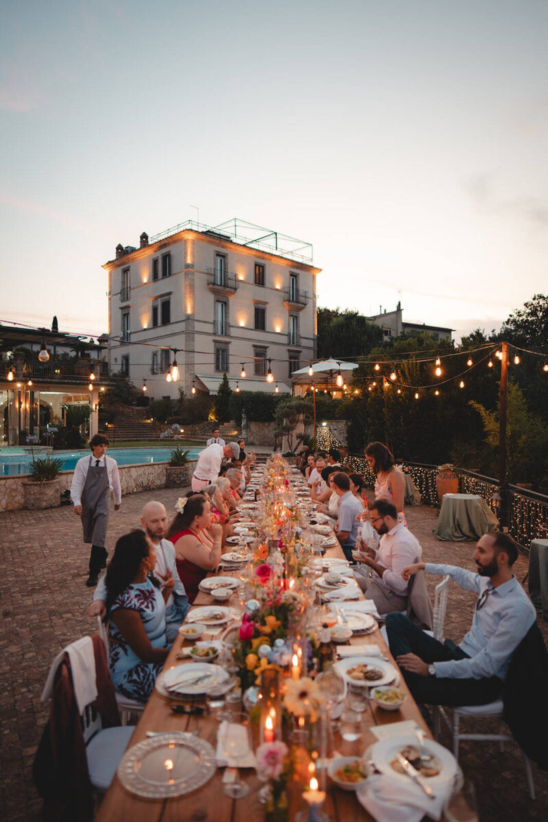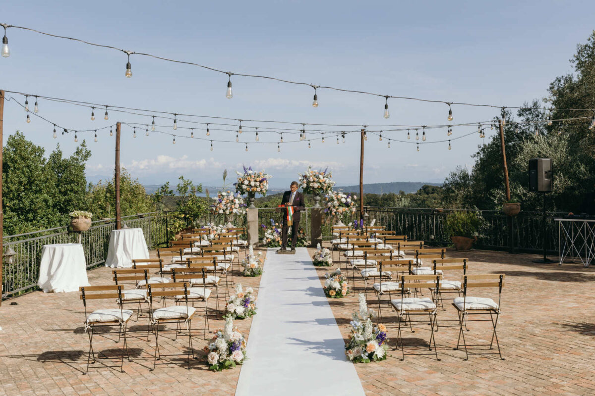 At Villa Clodia, the experience begins the moment guests arrive, stepping into the villa and taking in the quiet of the surrounding countryside. Time is given to settle in before gathering for a terrace ceremony, where the views stretch out towards Lake Bracciano. From there, the celebration shifts into an aperitif as the light softens, with conversations flowing across the gardens and open spaces. As evening draws in, everyone moves indoors or onto the terrace for dinner, where the atmosphere deepens and the celebration carries on in a way that feels effortless, guided by the setting rather than a fixed schedule.