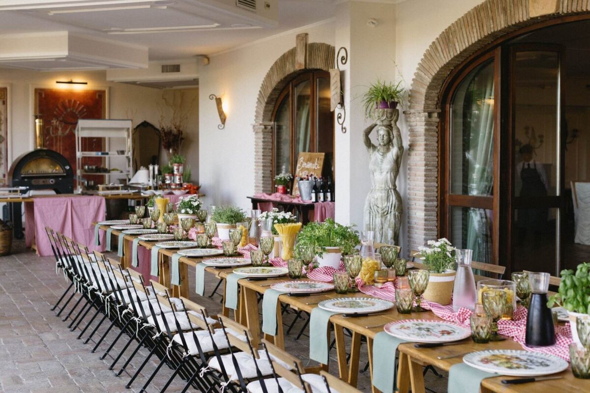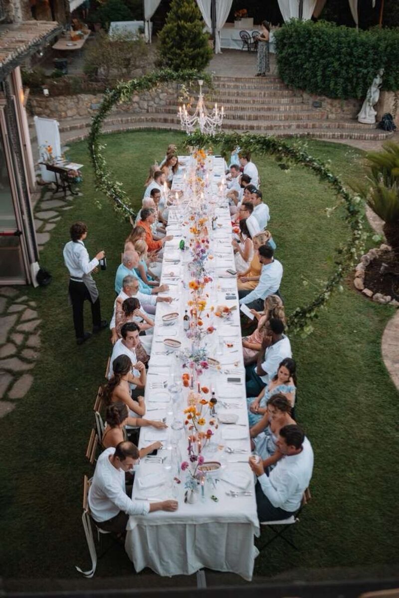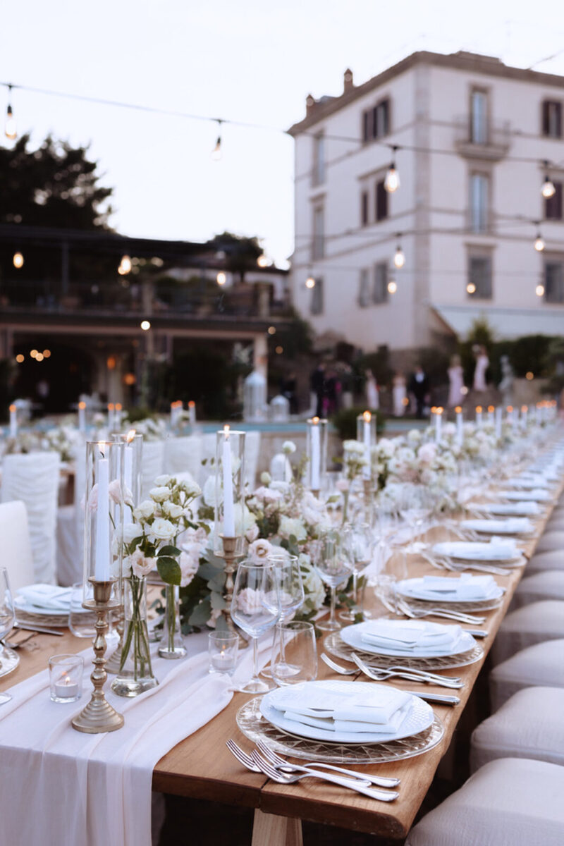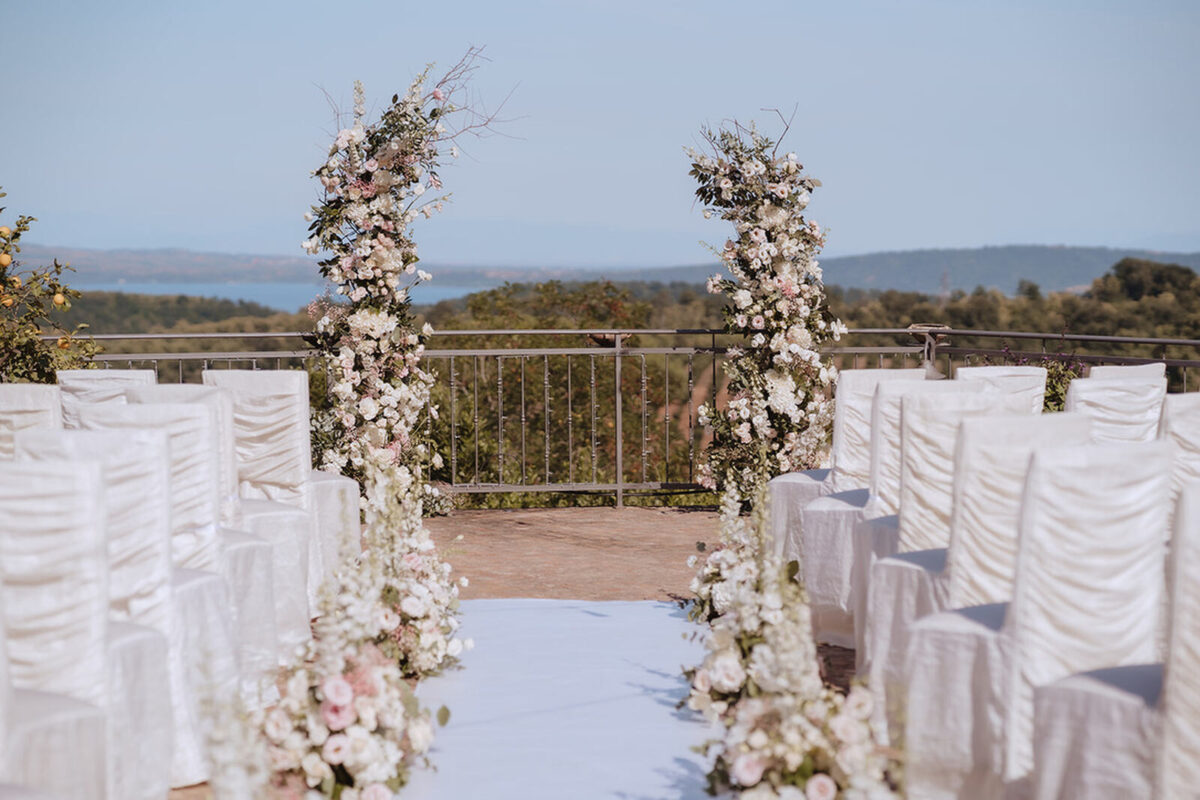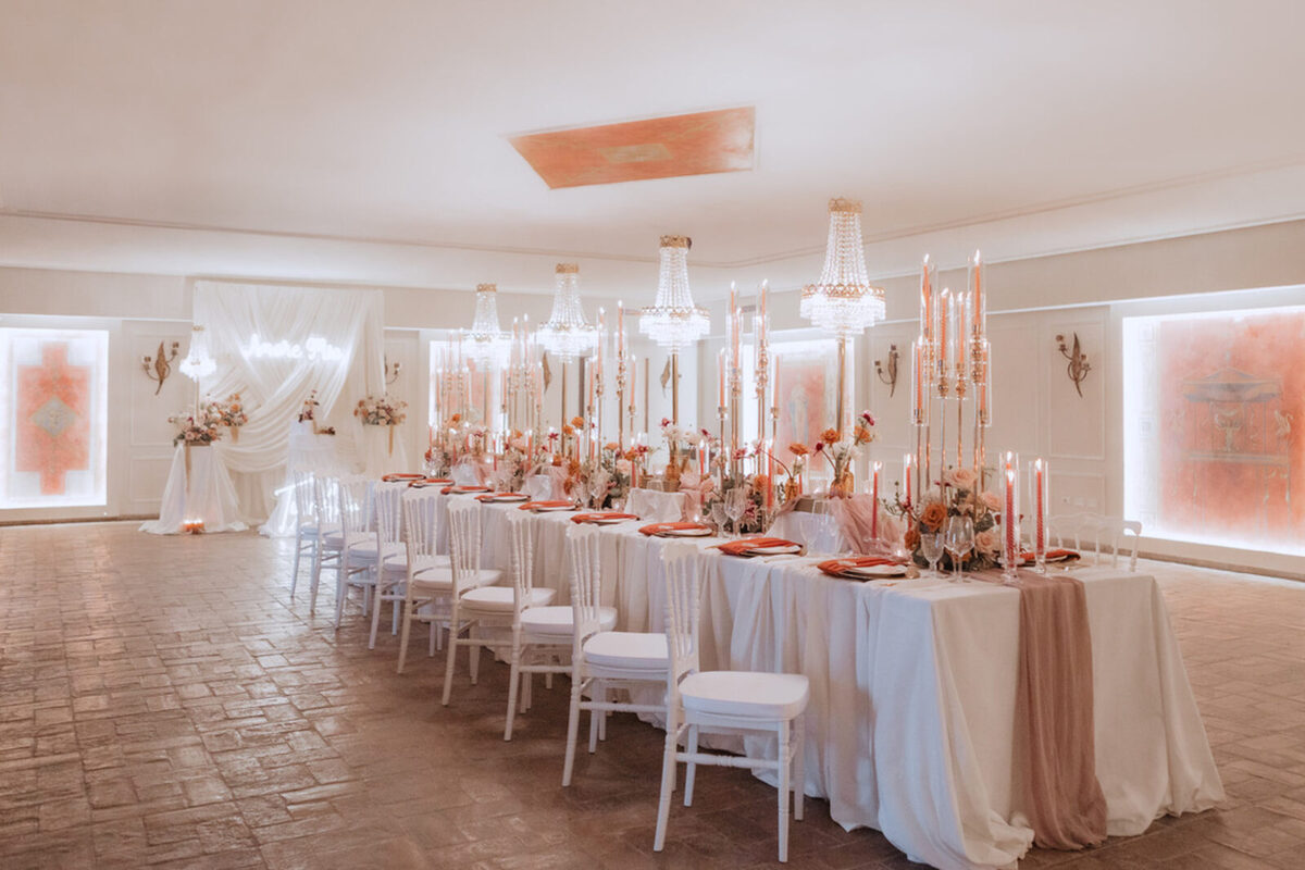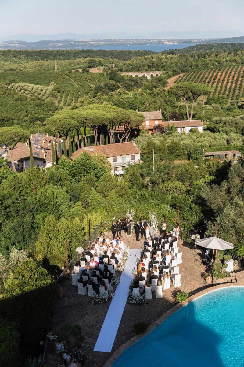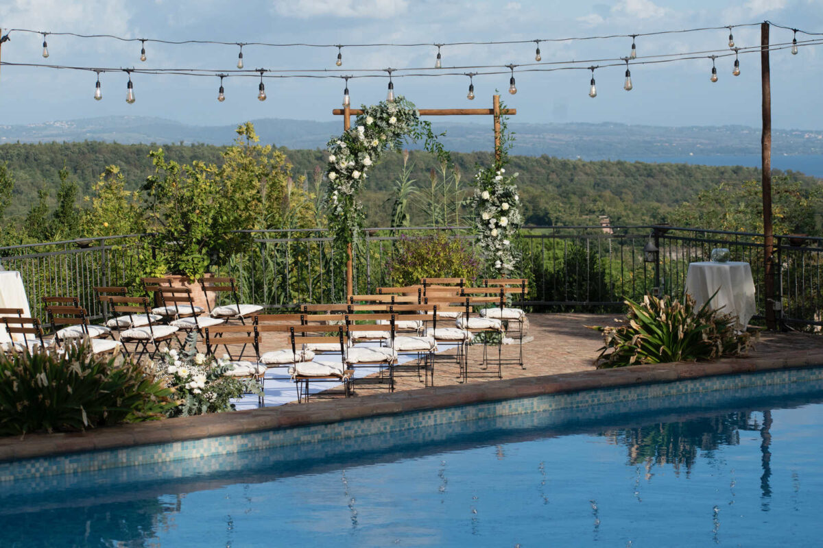 At Villa Clodia, the experience begins the moment guests arrive, stepping into the villa and taking in the quiet of the surrounding countryside. Time is given to settle in before gathering for a terrace ceremony, where the views stretch out towards Lake Bracciano. From there, the celebration shifts into an aperitif as the light softens, with conversations flowing across the gardens and open spaces. As evening draws in, everyone moves indoors or onto the terrace for dinner, where the atmosphere deepens and the celebration carries on in a way that feels effortless, guided by the setting rather than a fixed schedule.